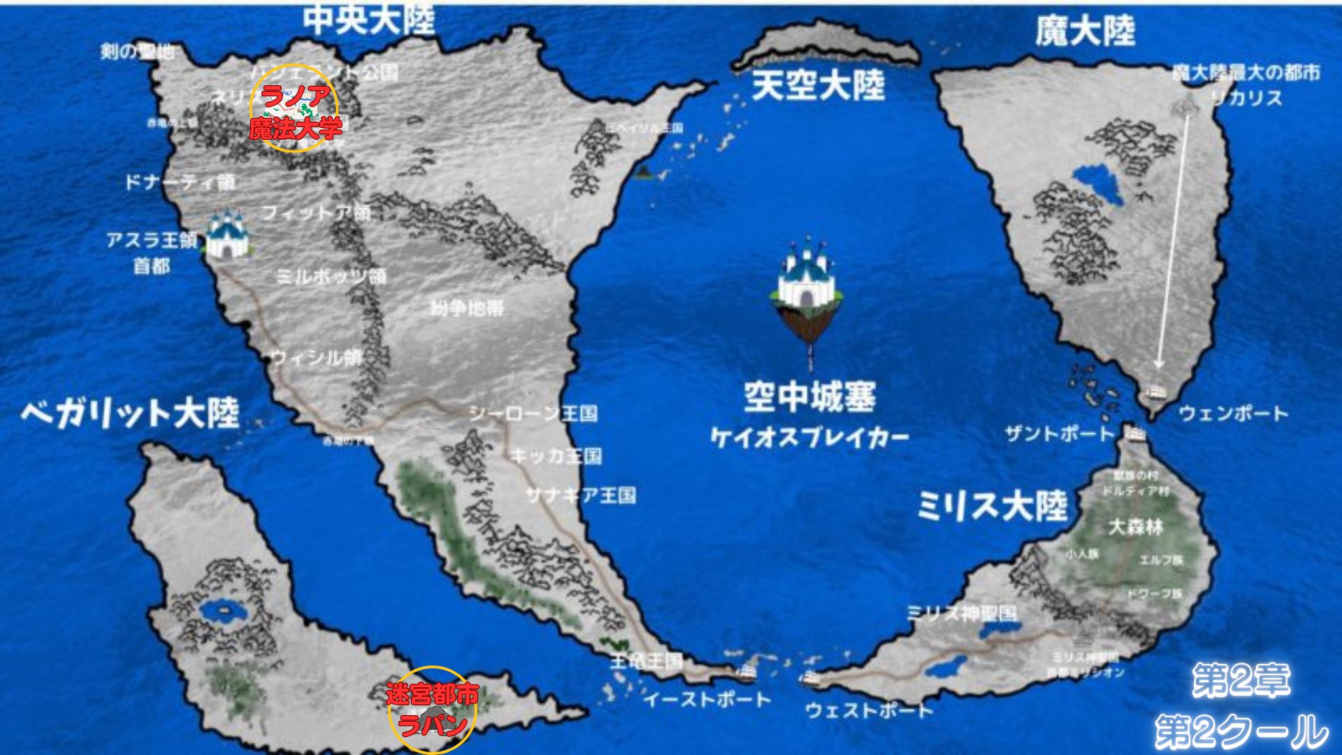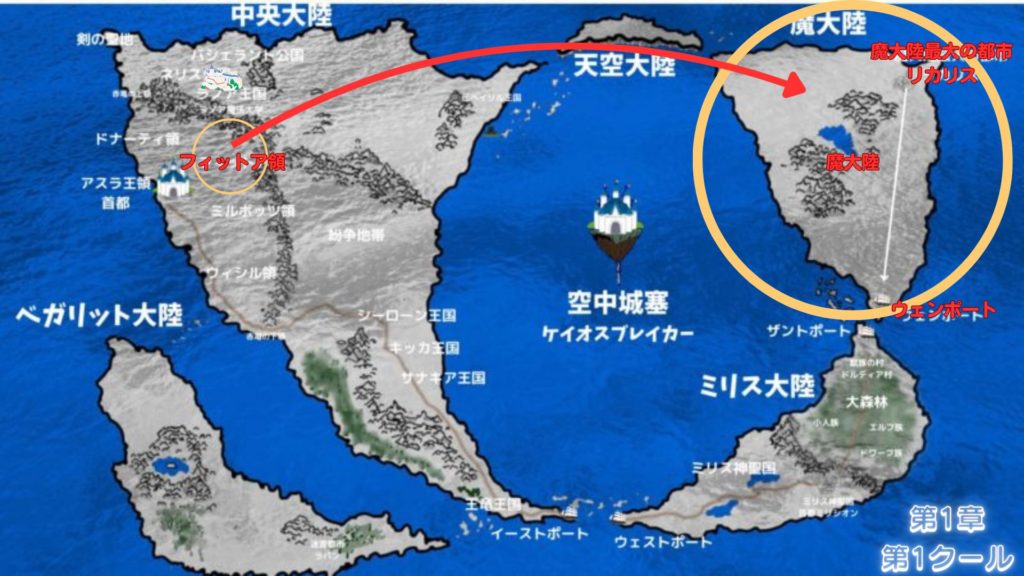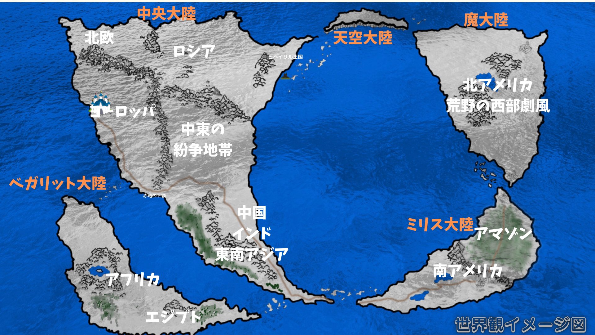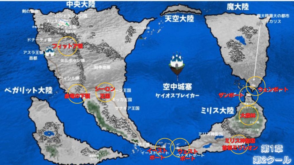 なお、天空大陸は、標高3,000mの断崖絶壁なので通り抜ける事はできないですし、船で一気に中央大陸に行ける船もない様なので、ルーデウス達が辿ったルートでしか辿り着けない様です。